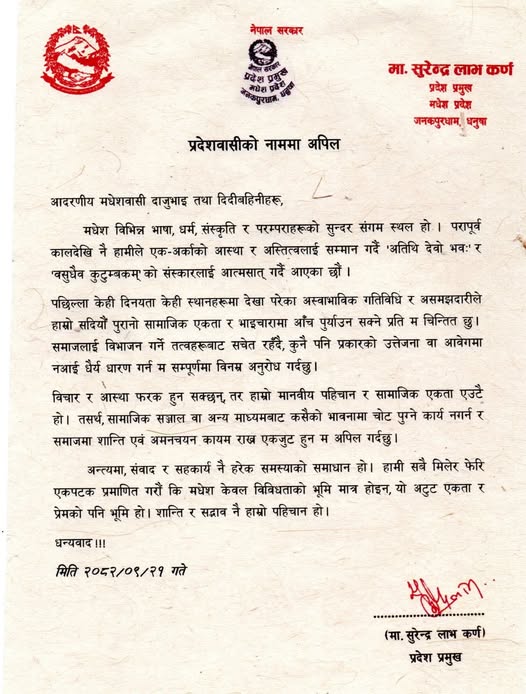 विरगन्जमा मा मस्जिद तोडफोड, आगजनीलगायतको घटनालाई लिएर आइतबार मुस्लिम समुदायले प्रदर्शन गरेको थियो । त्यस्तै हिन्दुको मन्दिर तथा देविदेवतामाथि अभद्र टिप्पणी गरिएको भन्दै सोमबार बिहानैदेखि हिन्दुवादीहरू प्रदर्शनमा उत्रिएका थिए । यस कार्य बढ्दै गएपछि मधेश प्रदेश प्रमुखले मधेशबासिका नाममा ‘बिचार...